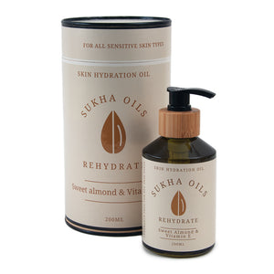 - Rehydrate – Lightweight and soothing, antioxidant rich almond oil blend with added vitamin E hydrates sensitive skin and supports collagen for a healthy, youthful glow.
