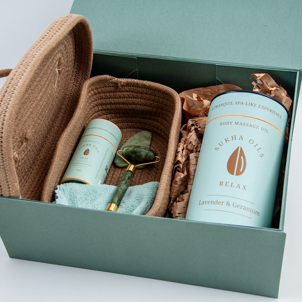 An indulgent self-care wellness basket with a calming lavender and geranium scent, perfect as a gift or personal treat.