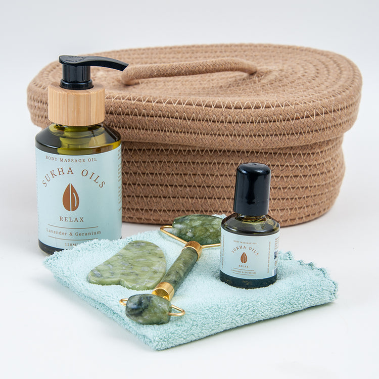 - Each Wellness Basket features a full sized 120ml pump bottle, a 15ml travel roll-on, a facial roller, gua sha massager and a microfiber face cloth.