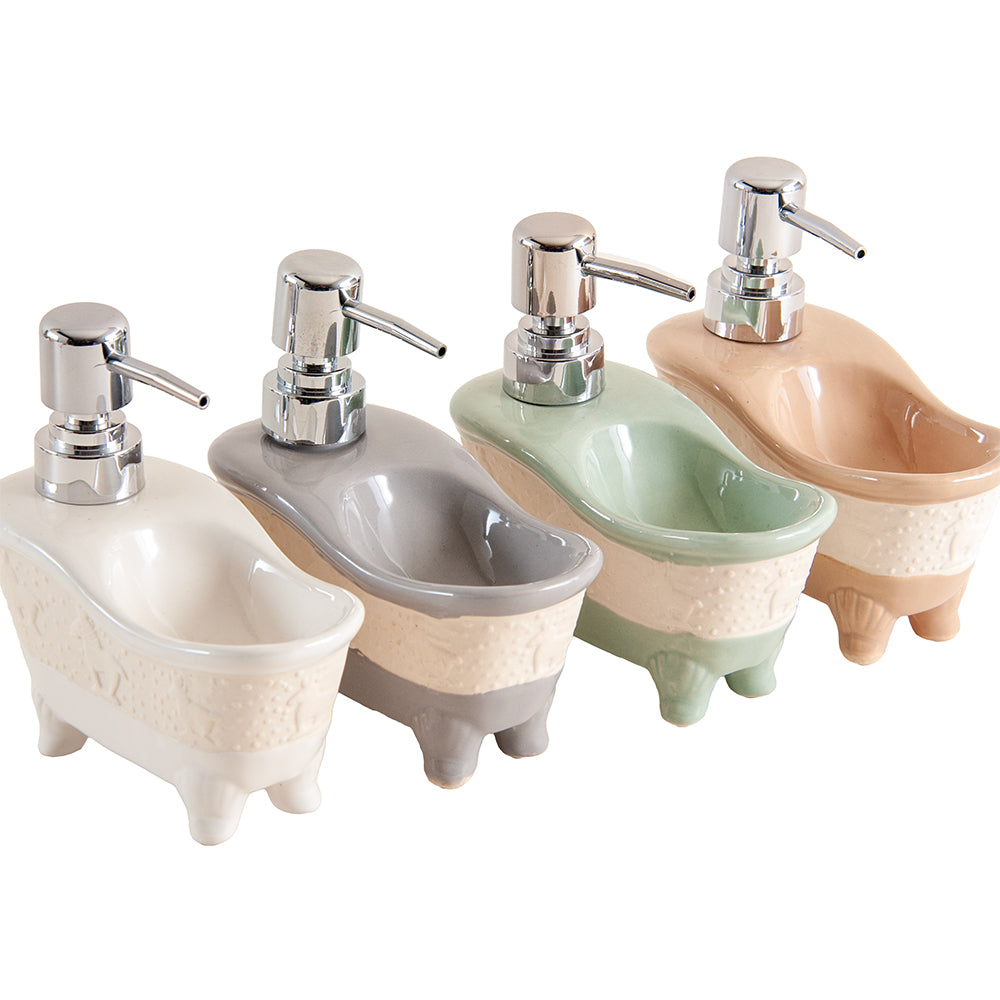 - The Cleopatra inspired mini bathtub soap dispenser adds flair to any room, crafted from durable ceramic with an easy pump aluminum head.