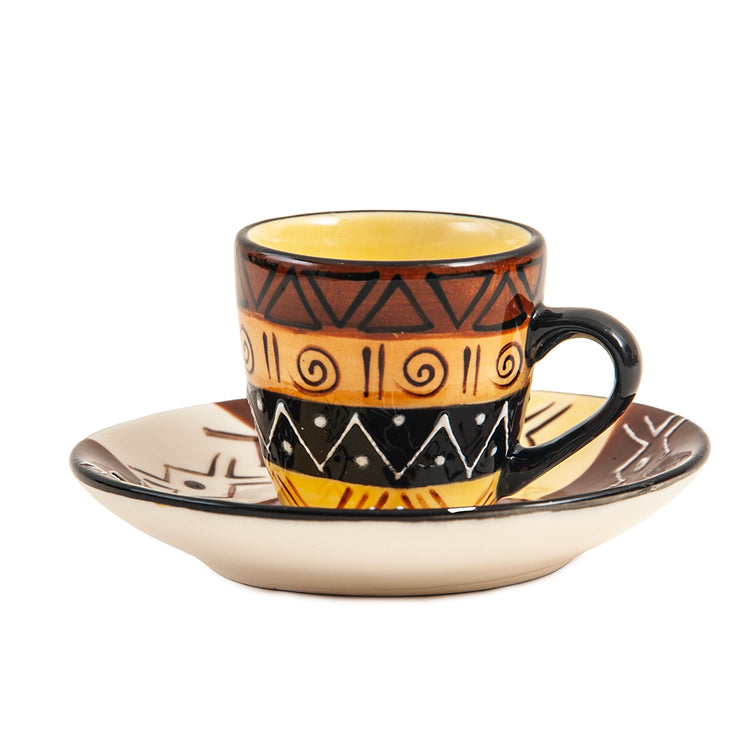 Bold, Earth tones inspired, cup and saucer, rooted in African design. Great for colourful homes, both functional and decorative.
