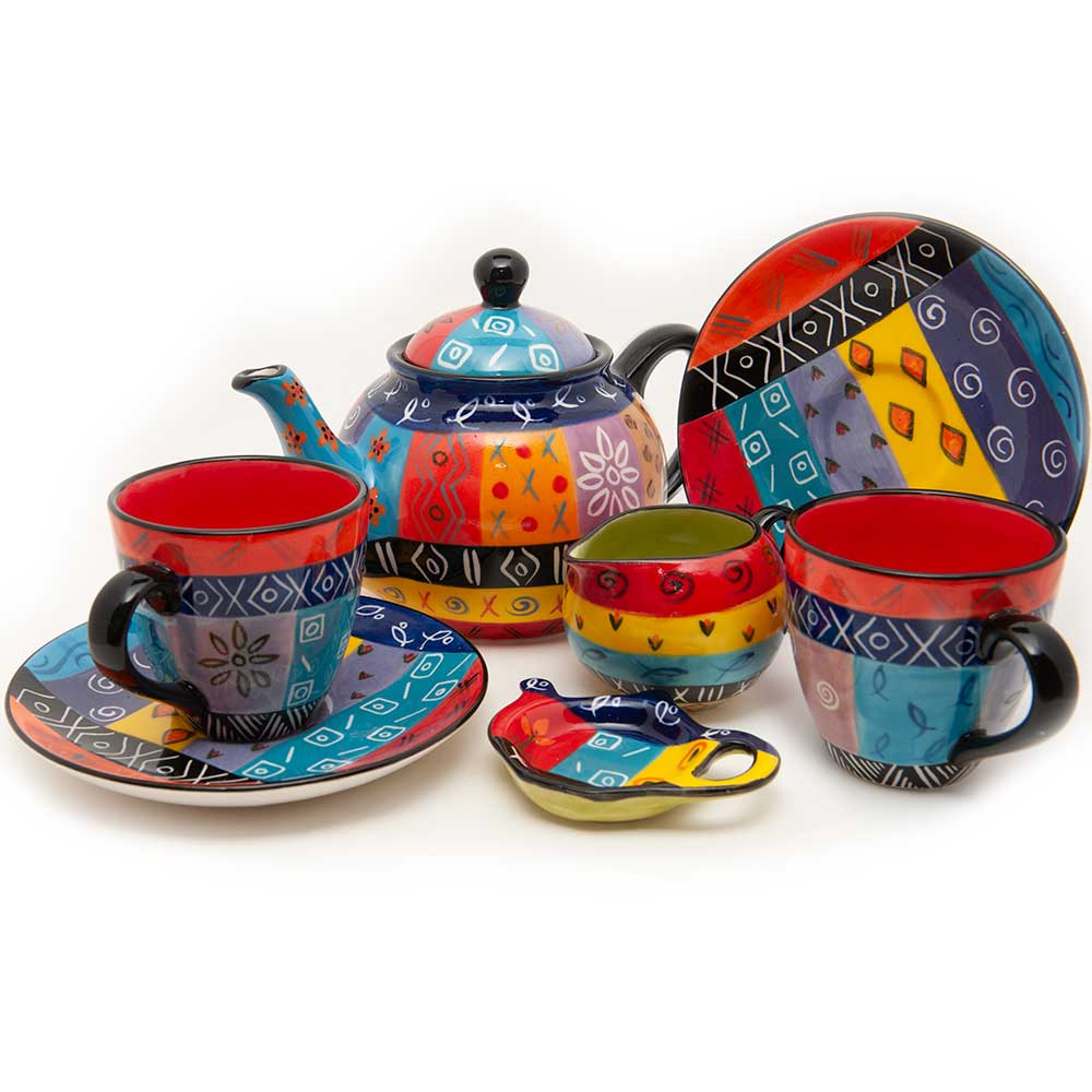- A vibrant ceramic cup and saucer, with a rainbow-inspired Multi-Coloured Ethnic design. Each piece is uniquely hand-painted, with variations adding to its charm. Ideal for colourful or African-inspired decor.