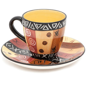 - A vibrant ceramic cup and saucer, with an African wilderness inspired, Safari Gold design. Each piece is uniquely hand-painted, with variations adding to its charm. Ideal for colourful or African-inspired decor.