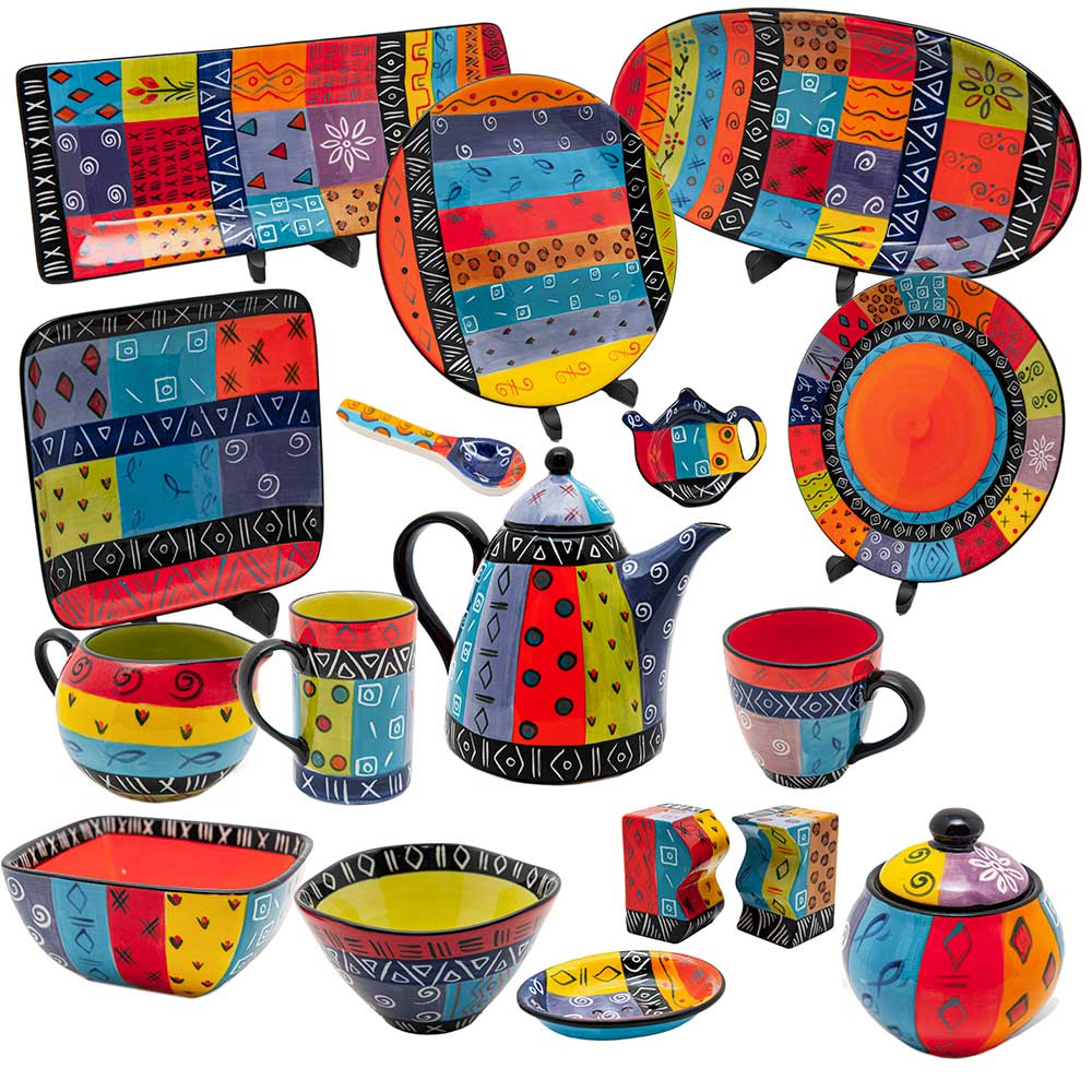 - A vibrant ceramic salad bowl with a rainbow inspired, Multi Coloured Ethnic design. Each piece is uniquely hand-painted, with variations adding to its charm. Ideal for colourful or African-inspired decor.