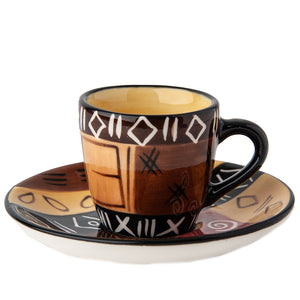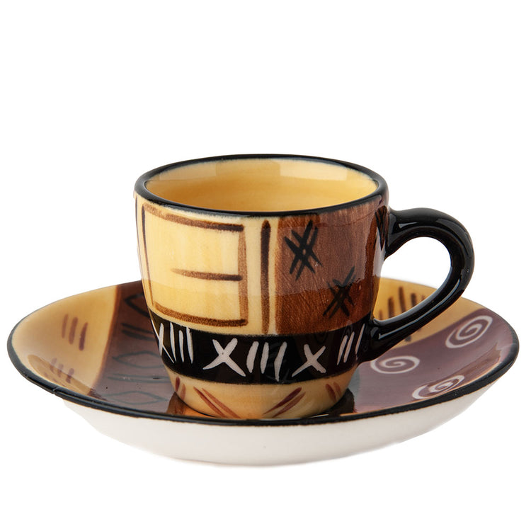 - A vibrant, ceramic espresso cup and saucer, with an African wilderness inspired, Safari Gold design. Each piece is uniquely hand-painted, with variations adding to its charm. Ideal for colourful or African-inspired decor.