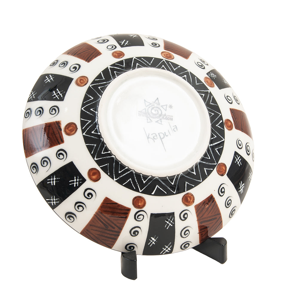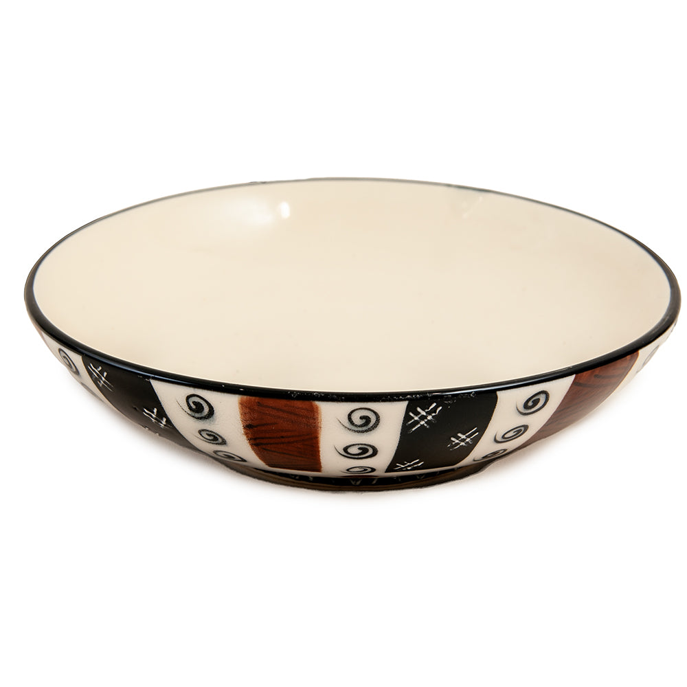 - A vibrant ceramic, round pasta bowl, with an African inspired, Ebony & Ivory design. Each piece is uniquely hand-painted, with variations adding to its charm. Ideal for colourful or African-inspired decor.