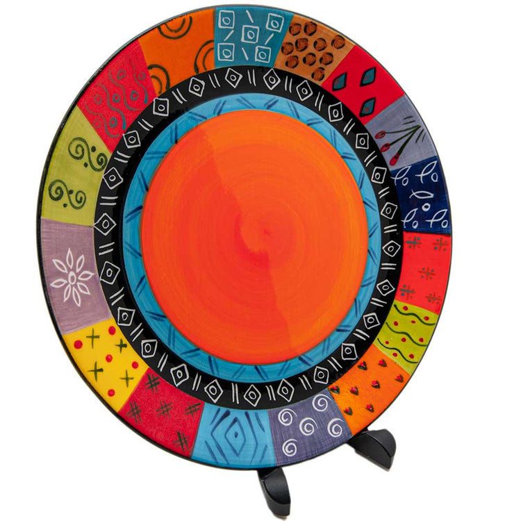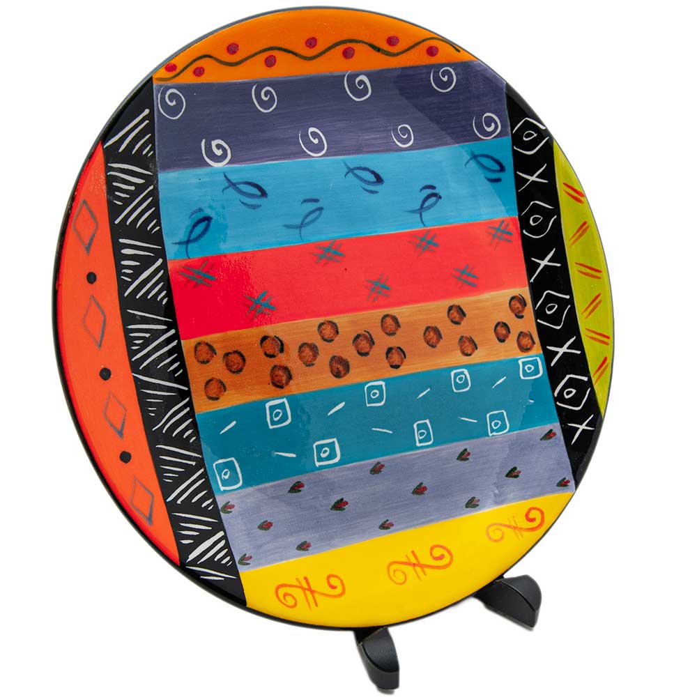 - A vibrant ceramic dinner plate with a rainbow-inspired Multi-Coloured Ethnic design. Each piece is uniquely hand-painted, with variations adding to its charm. Ideal for colourful or African-inspired decor.