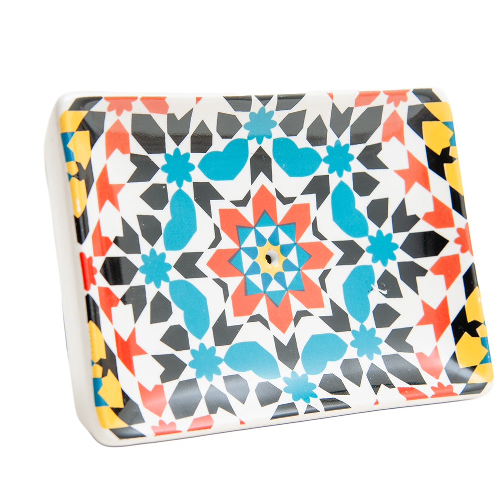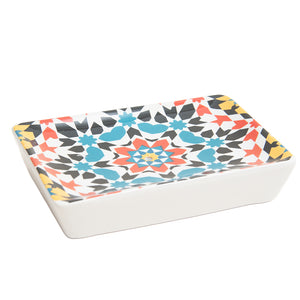 Length 12.5cm x Width 8.8cm x Height 2.5cm. White ceramic soap dish with colorful mosaic print. Easy to clean. Available in various designs. Soap not included.