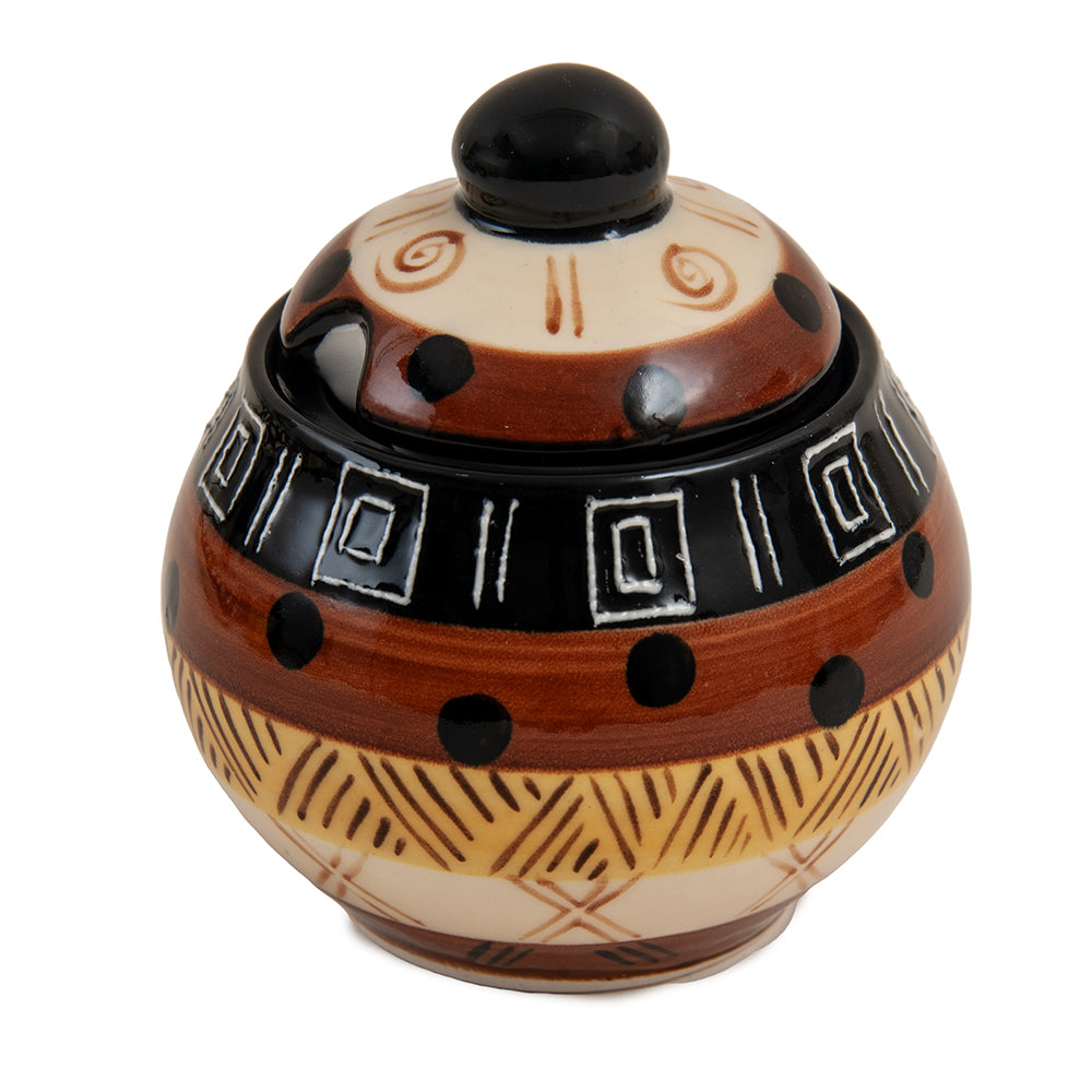 - A vibrant ceramic sugar bowl and lid, with an Africa inspired, Ebony & Ivory design. Each piece is uniquely hand-painted, with variations adding to its charm. Ideal for colourful or African-inspired decor.