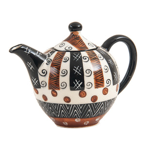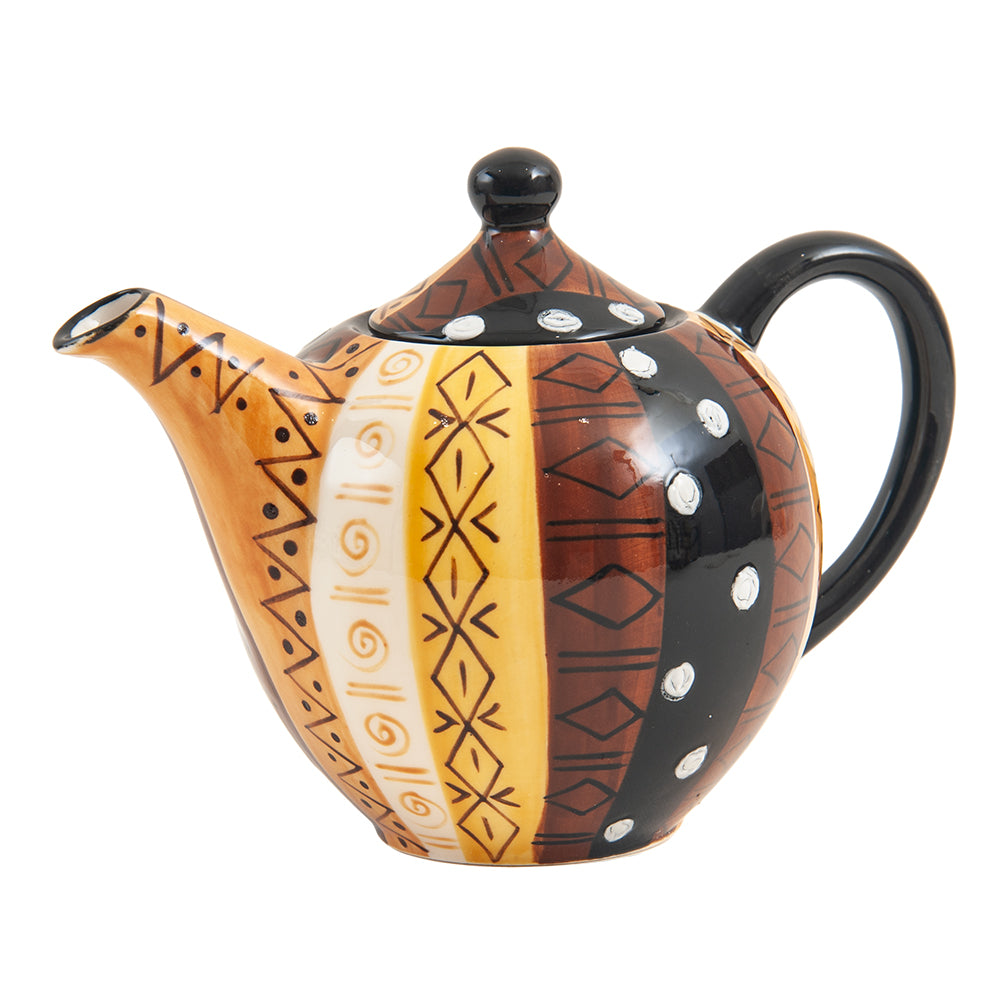 - A vibrant ceramic teapot, with an African inspired, Ebony & Ivory design. Each piece is uniquely hand-painted, with variations adding to its charm. Ideal for colourful or African-inspired decor.