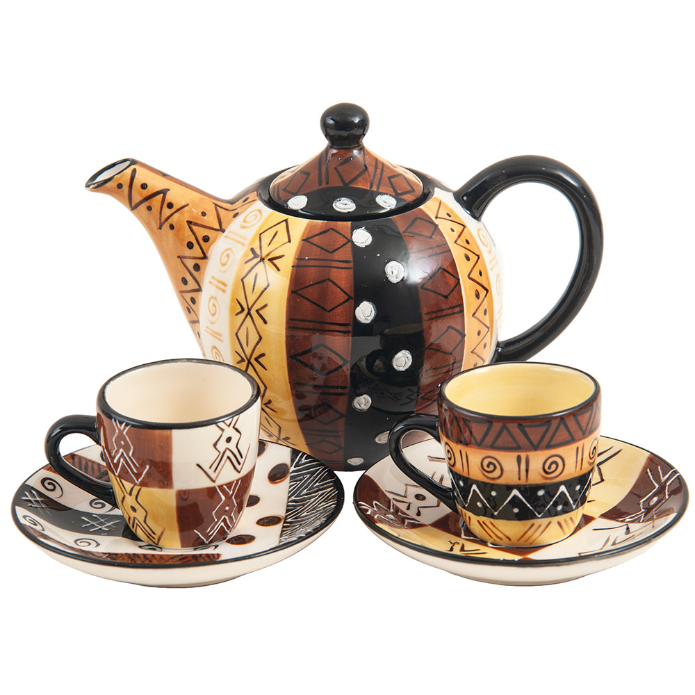 - A vibrant ceramic tea set for two, with a traditional African inspired, Ebony & Ivory design. Each piece is uniquely hand-painted, with variations adding to its charm. Ideal for colourful or African-inspired decor.