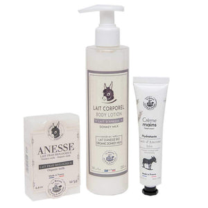 - Contains 1 x 125g donkey milk soap, 1 x 30ml donkey milk hand cream, 1 x 250ml donkey milk body lotion.