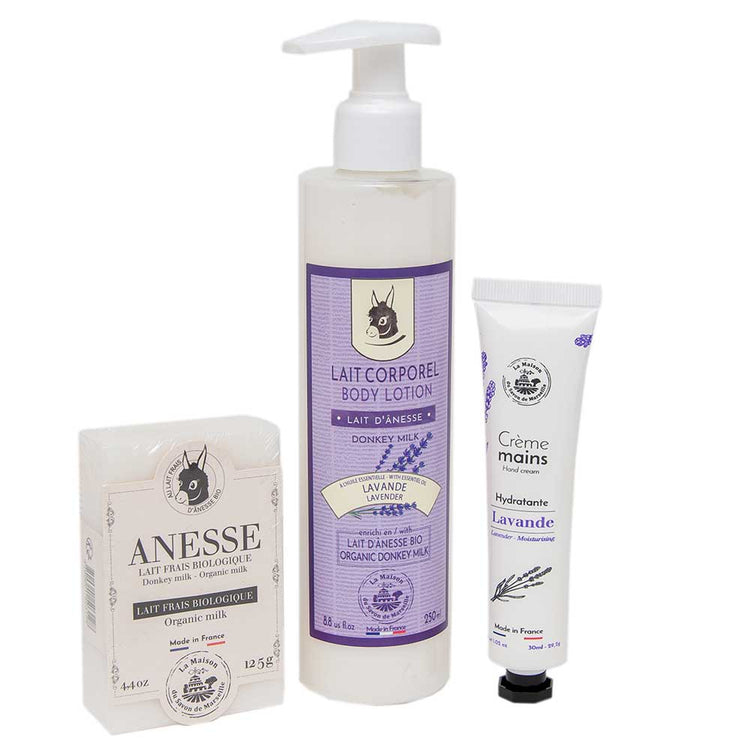 - Contains 1 x 125g lavender donkey milk soap, 1 x 30ml lavender hand cream, 1 x 250ml lavender body lotion.