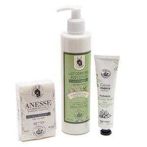 - Contains 1 x 125g donkey milk soap, 1 x 30ml sweet almond hand cream, 1 x 250ml sweet almond body lotion.