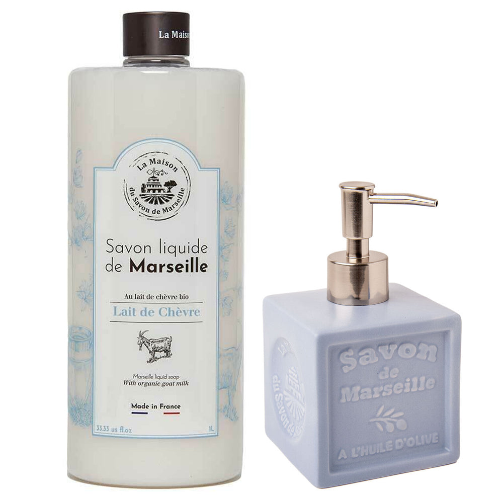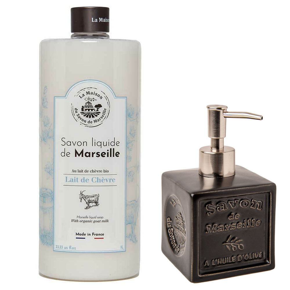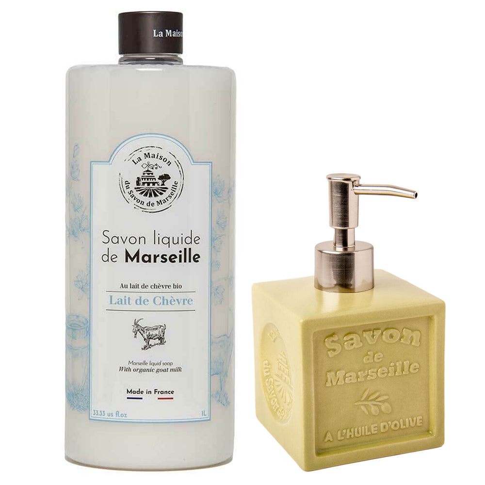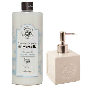 French Liquid Soap, Ceramic Soap Dispenser, Goats Milk and Olive Oil, Goats Milk Fragrance, 1 Litre and 300ml