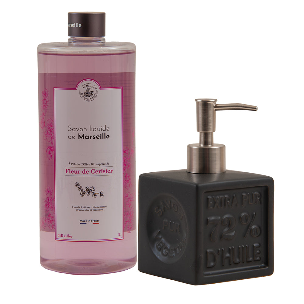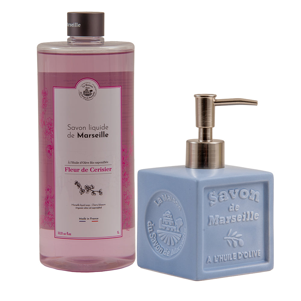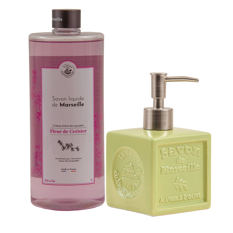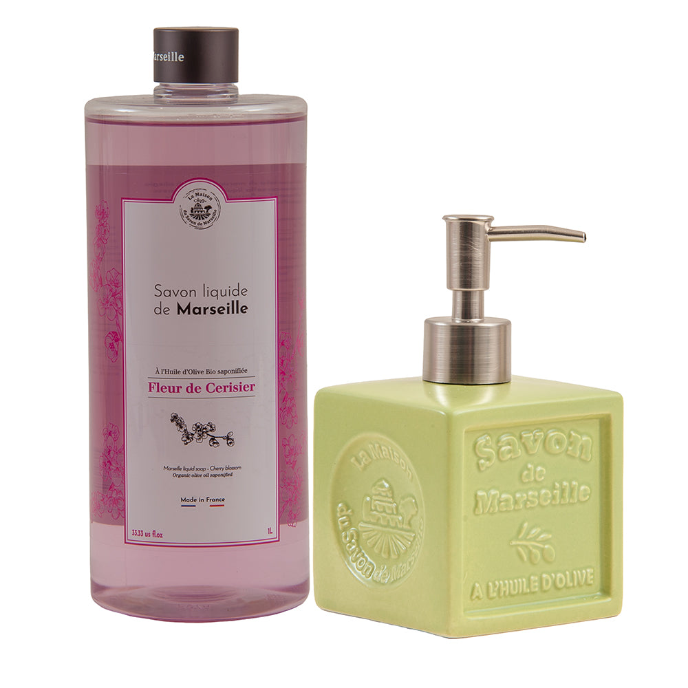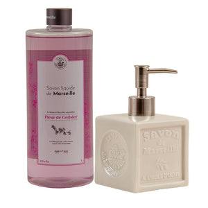 French Liquid Soap, Ceramic Soap Dispenser, Olive Oil, Cherry Blossom Fragrance, 1 Litre and 300ml