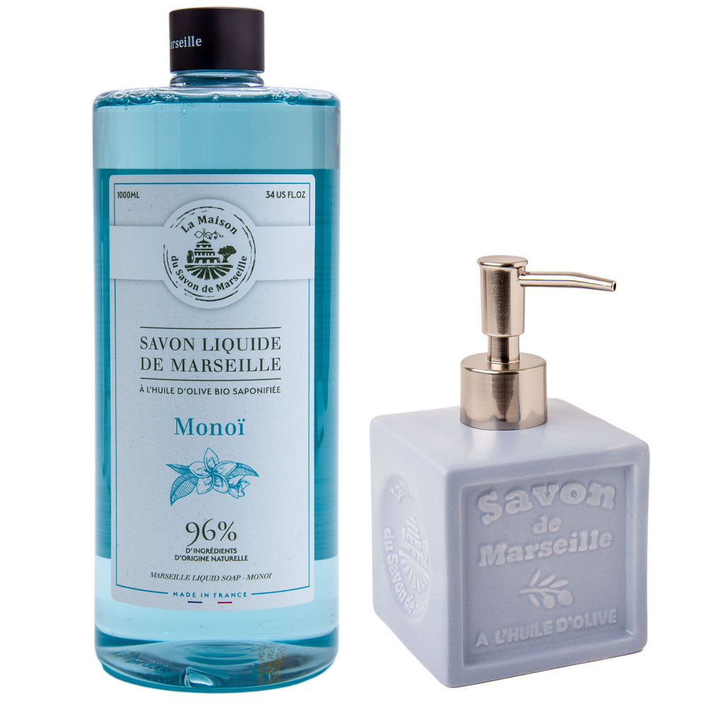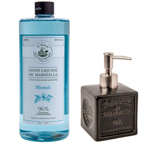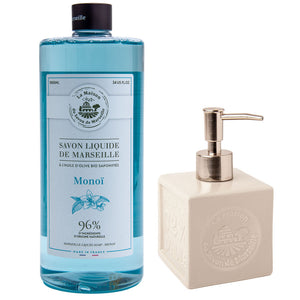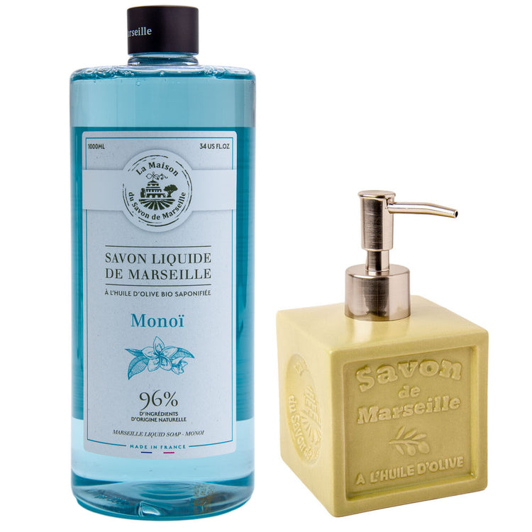 French Liquid Soap, Ceramic Soap Dispenser, Olive Oil, Monoi Fragrance, 1 Litre and 300ml