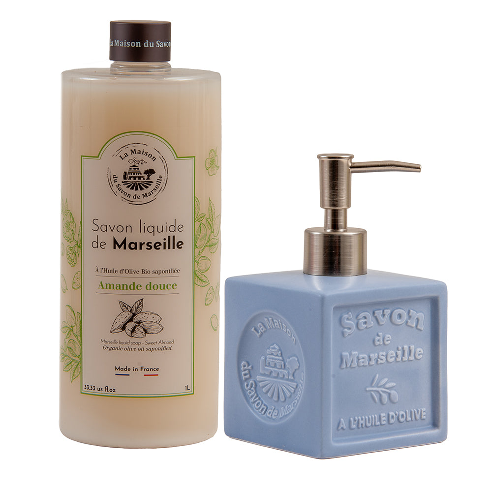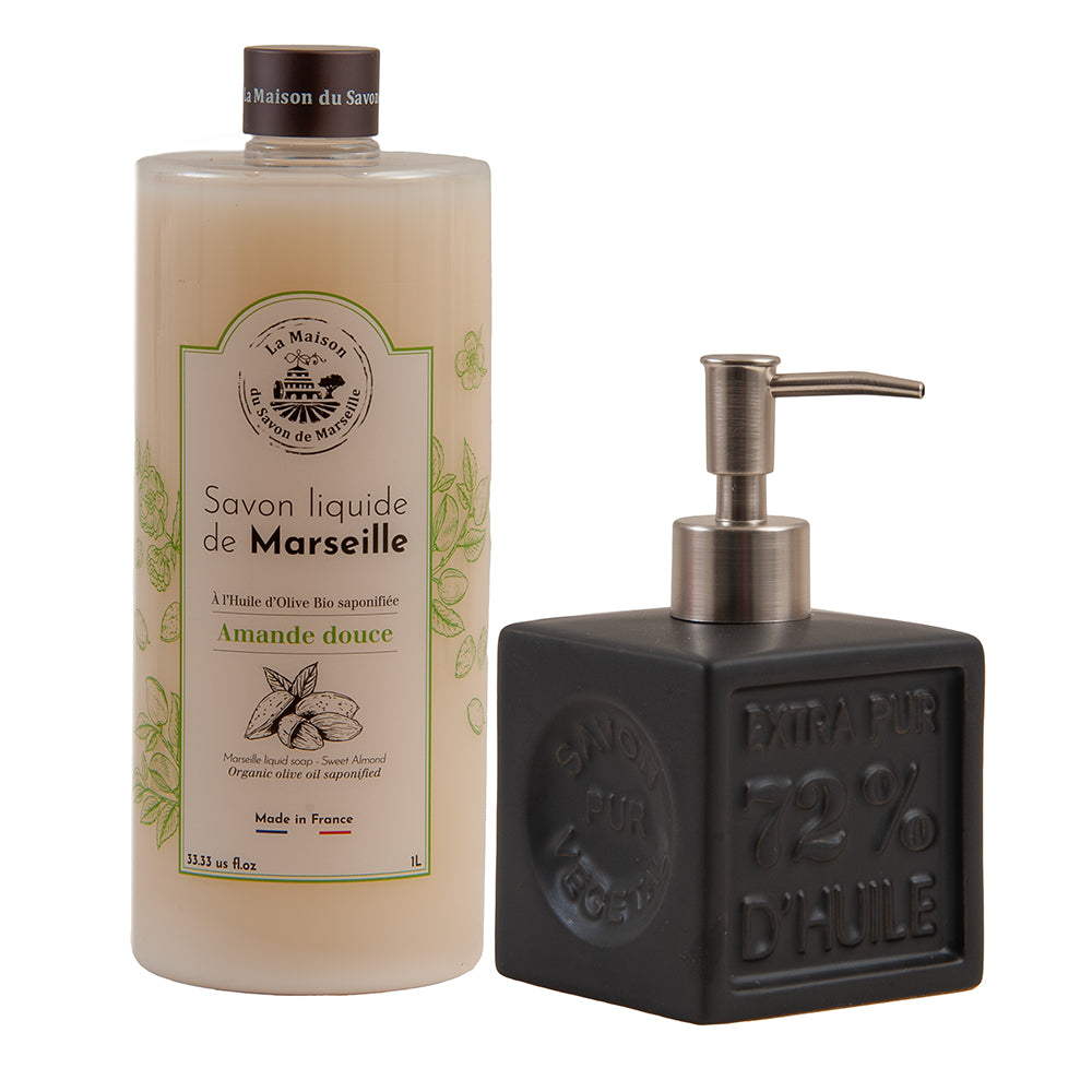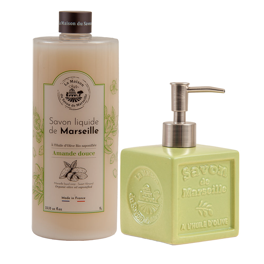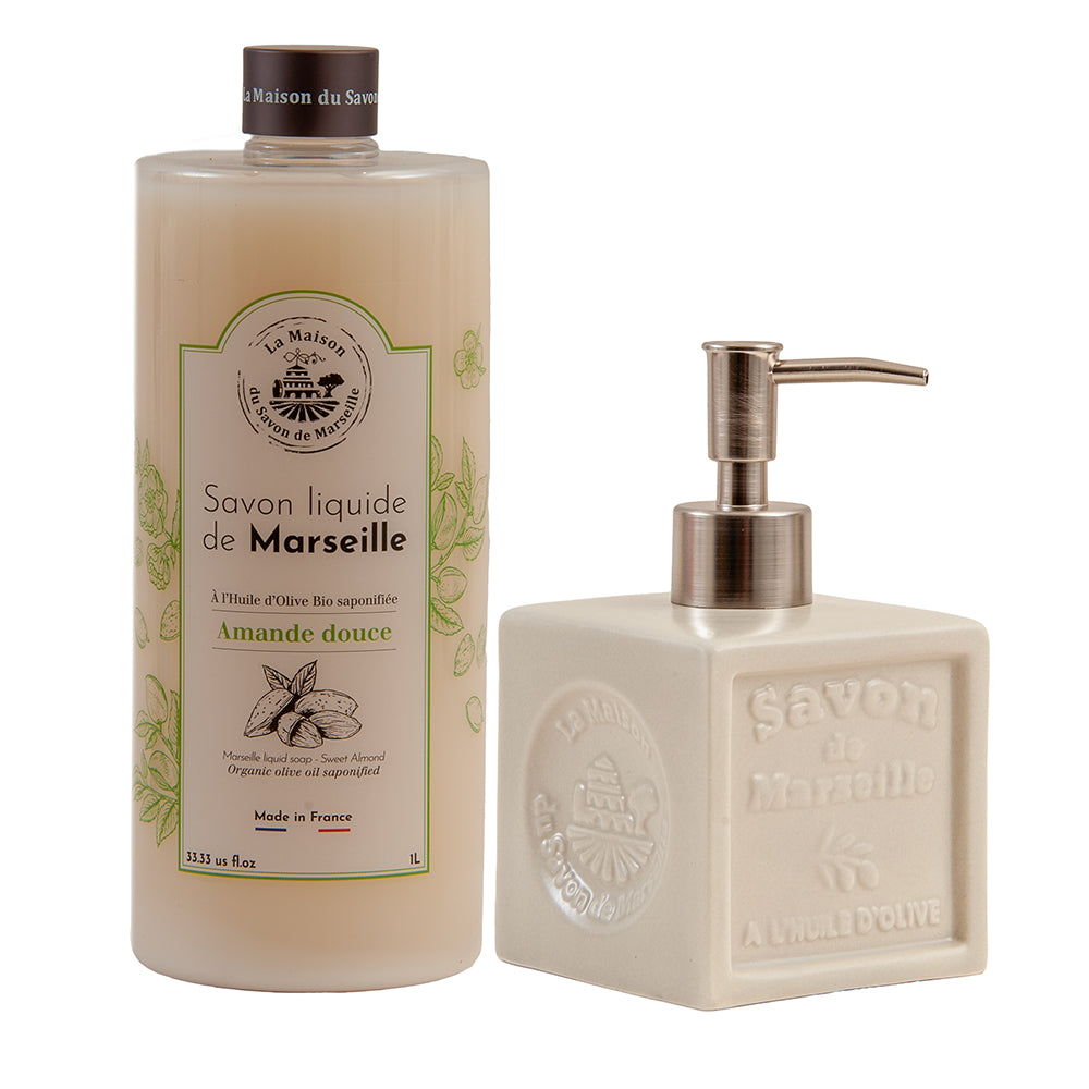 French Liquid Soap, Ceramic Soap Dispenser, Olive Oil, Sweet Almond Fragrance, 1 Litre and 300ml